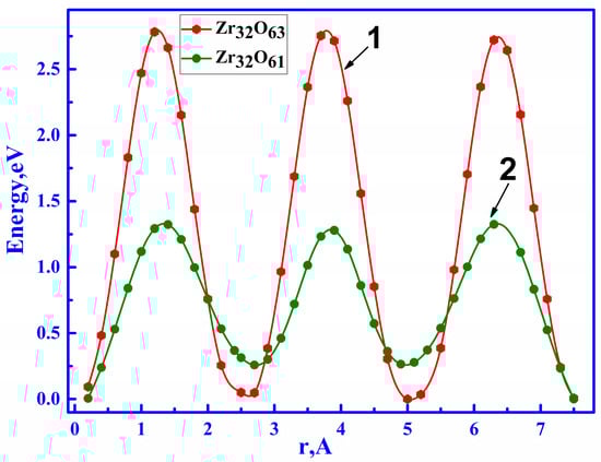 In the graph presented here and in subsequent analyses, the vertical axis represents the relative total energy of the system. It was found that the system’s energy reaches a minimum when the oxygen atom occupies the vacancy and increases when it is near zirconium atoms. The dependence of the total energy on the oxygen atom’s position exhibits a sinusoidal pattern, indicating the presence of periodic energy barriers and stable configurations within the structure. Figure 9 shows the energy profile along the oxygen ion migration path in defective cubic zirconia (c-ZrO2) through vacancy sites. Curve 1 in Figure 9 corresponds to the migration of an oxygen ion into a single vacancy site (Figure 3a), while curve 2 represents migration through three oxygen vacancies (Figure 3b). The energy maxima observed at distances of 1.2–1.4 Å, 3.7–3.9 Å, and 6.3 Å indicate energy barriers that arise when the oxygen atom passes through a zirconium plane, interacting with Zr atoms and increasing the system’s energy