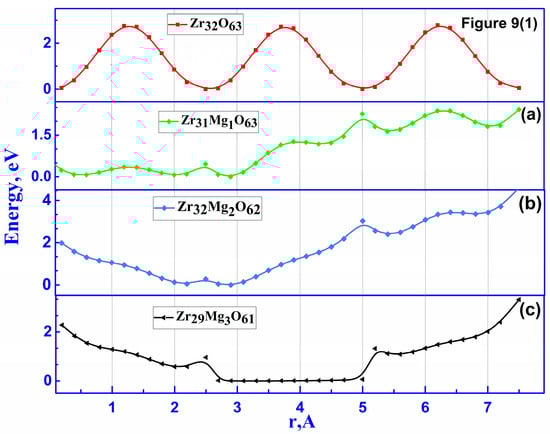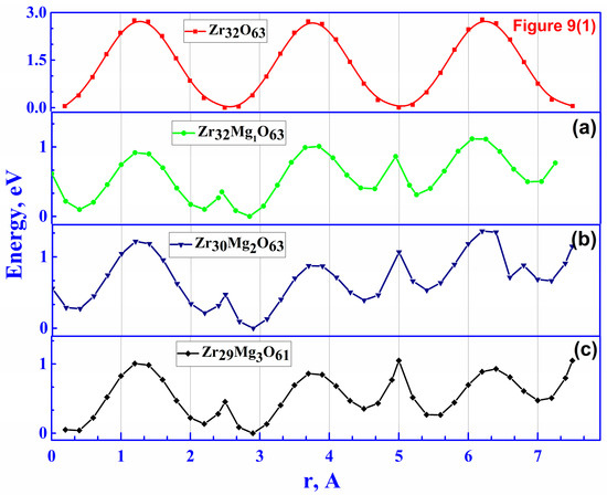 In Figure 10b, the dependence of the total energy of the system on the oxygen ion migration distance in the Zr30Mg2O62 structure, where two zirconium atoms are replaced by magnesium along the migration path, is shown.