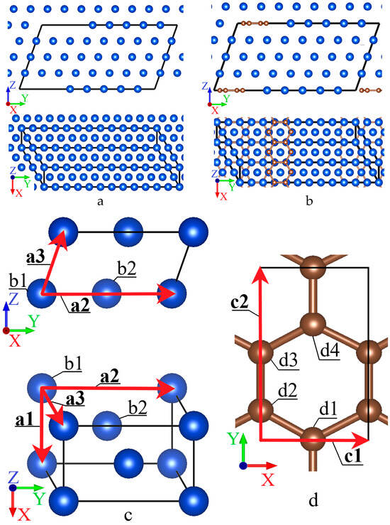 Projections of structures with a stacking fault on the YZ and XY planes in pure Cu (a) and in the Gr/Cu composite (b). Copper atoms are shown in blue, and carbon atoms in brown, with interatomic bonds additionally shown for graphene. The black line shows the calculation cell. Scheme of the elementary calculational cell of Cu (c) and graphene (d). The arrows indicate the translation vectors.