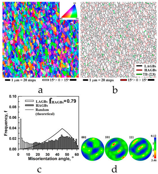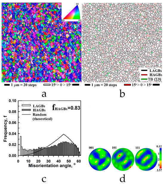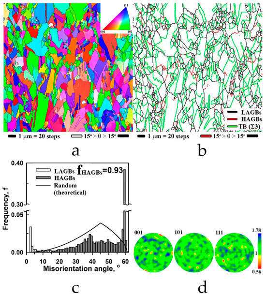 Microstructural analysis was performed at a site of 3 mm away from the center of specimens using a Tescan Mira 3LMH scanning electron microscope (TESCAN, Brno, Czech Republic) with backscattered electron detectors at 20 kV accelerating voltage. EBSD analysis was carried out on the same scanning electron microscope using the OXFORD HKL Channel 5 microanalysis system. Due to the limited angular accuracy of EBSD, boundaries with misorientations below 2° were excluded from consideration. A 15° threshold was applied to differentiate low-angle grain boundaries (LAGBs) and high-angle grain boundaries (HAGBs). LAGBs and HAGBs on EBSD maps are depicted as red and black lines, respectively, and TBs are depicted as green lines. To improve the reliability of the EBSD data, small grains comprising five or less pixels were automatically removed from the maps. Transmission electron microscopy studies were performed on the JEM 2100 Plus microscope at an accelerating voltage of 200 kV. Selected area diffraction pattern was taken from the area 0.28 μm2. Thin foils for TEM analysis were cut from the outer region (~3 mm from the sample center) and mechanically thinned to ~100 μm. Final thinning to electron transparency was performed by twin-jet electro-polishing using a solution of 30% nitric acid in methanol. The polishing endpoint was detected automatically via short-circuit current drop.
