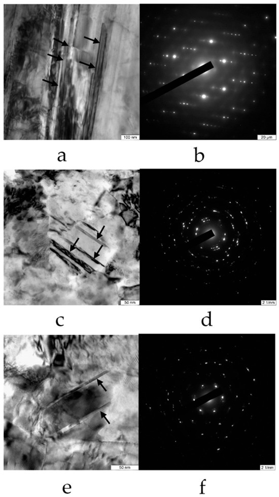 It should be noted that the fraction of Σ3 twin boundaries decreased drastically after HPT processing. This effect can be caused by strain-induced deviation from the exact twin/matrix relationship and thus transformation of the twin boundaries into random HAGBs during deformation However, it is necessary to consider that the scanning step during EBSD analysis was 50 nm, and nanotwins with a thickness of about 10–20 nm cannot be detected reliably in the samples. Therefore, a more detailed study of the foil was carried out by means of an transmission electron microscope at high magnifications that allowed us to reveal many 10–20 nm thick nanotwins in Cu foils (Figure 5a,b), similar to those addressed in [20], and minor amounts of nanotwins in HPT-processed composites both with graphene (Figure 5c,d) and without graphene (Figure 5e,f). Nanotwins in Figure 5 are indicated by arrows. Thus, electron microscopy studies, both SEM and TEM, indicate a significant decrease in the fraction of twin boundaries and reveal that sub-boundaries were developed in the samples during HPT processing.