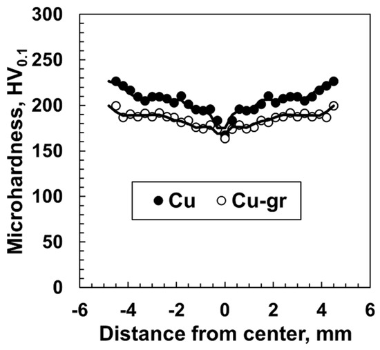 Microhardness distribution in the HPT-processed Gr/Cu and pure Cu samples.