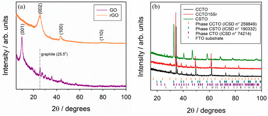 Figure 1a presents the XRD results for the synthesized GO and rGO. The GO is confirmed by its characteristic sharp peak at 2θ ≈ 10 degrees [35], which gives a calculated interplanar of 0.879 nm. This value aligns with those reported in the literature, indicating an interplanar distance for GO ranging from 0.74 to 0.89 nm, depending on the quantity of oxygen-containing functional groups incorporated into the graphite layers [35]. The successful conversion to rGO is evidenced by the disappearance of this peak and the appearance of a broad peak at 2θ ≈ 24.9° (and others at 42.68° and 78.00°) [29,30]. These two precursor materials were subsequently incorporated into the CCSTO system to form composite films, which were deposited using the doctor blade technique. Figure 1b shows the XRD for CaCu3−xSrxTi4O12 (0 ≤ x ≤ 3.0) films, which can be observed in all samples showing high crystallinity. Also, peaks associated with the FTO substrate can be observed. On the other hand, the composition with x = 0.00 exhibited only the CCTO phase (Inorganic Crystal Structure Database (ICSD) no. 259849), corresponding to a cubic perovskite structure with an Im3 space group. In contrast, the composition with x = 3.00 showed only the CSTO phase (ICSD no. 190332), with an orthorhombic structure and Ibmm space group. For intermediate composition, x = 0.15, the material was observed to be a phase mixture of CCTO and CSTO, which is in nice agreement with the literature [20].