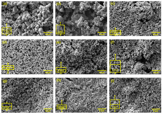 Upon examining Figure 2g,h,i, presented particle sizes of 0.304 µm, 0.406 µm, and 0.403 µm, respectively. Although the particle distribution was similar, the distribution associated with CSTO-6rGO was larger when compared with CSTO. The CSTO and CSTO-6GO samples presented a more porous appearance.