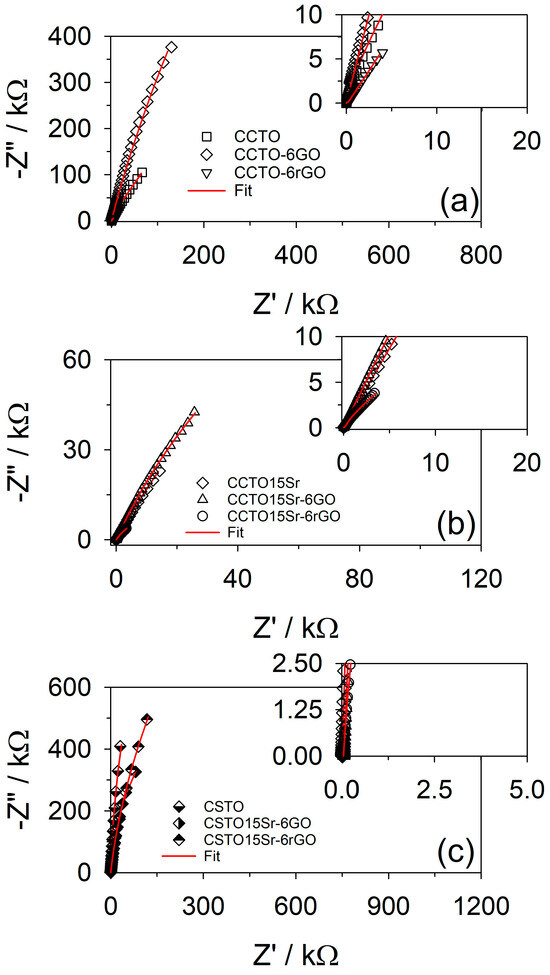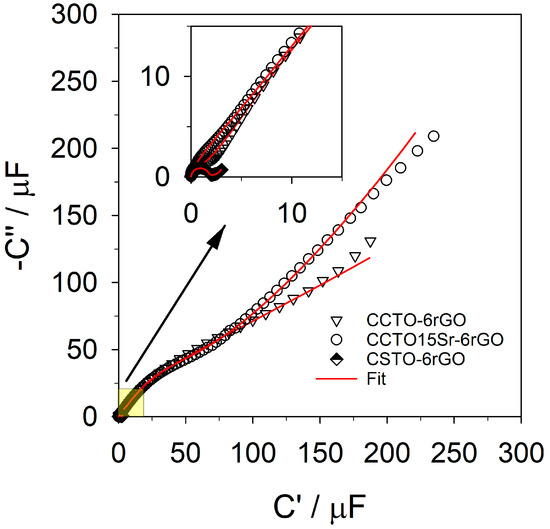 In this study, although further detailed investigation is warranted and is currently in progress, particular attention should be given to the influence on highly resistive systems. In such contexts, and as already observed in other classes of systems [38,39,40], the role of capacitance may also become a significant factor to consider (Figure 4). It should be emphasized that this work is still under development and the results presented here are preliminary. Nevertheless, our findings indicate that the capacitance of sample CCTO15Sr-6rGO is approximately 202 mF, whereas samples CCTO-6rGO and CSTO-6rGO exhibit capacitance values of 8.7 mF and 1.6 mF, respectively. The capacitance extracted from electrochemical impedance spectroscopy is consistent with that calculated from cyclic voltammetry. This finding supports the reliability of the electrochemical evaluation.