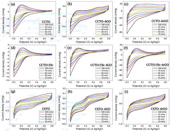 CV curves for CCTO, CCTO15Sr, and CSTO variants labels: (a) CCTO, (b) CCTO-6GO, (c) CCTO-6rGO, (d) CCTO15Sr, (e) CCTO15Sr-6GO, (f) CCTO15Sr-6rGO, (g) CSTO, (h) CSTO-6GO, (i) CSTO-6rGO. The tests were conducted in 1M H2SO4 electrolyte at various scan rates in the range of 10–100 mV/s.
