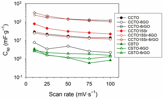 At a scan rate of 10 mV/s, Csp for CCTO-6rGO reached 237.76 mF·g−1, compared to 29.86 mF·g−1 for pure CCTO and 7.83 mF·g−1 for CCTO-6GO. This enhancement remained consistent even at higher scan rates. Similarly, among the CCTO15Sr samples, CCTO15Sr-6rGO demonstrated the highest specific capacitance values; specifically, a Csp of 321.63 mF·g−1 was obtained at 10 mV/s, which is better than those of both pure CCTO15Sr (80.19 mF·g−1) and CCTO15Sr-6GO (25.73 mF·g−1).