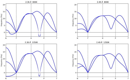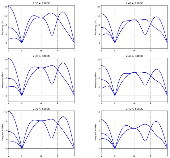 For each temperature and pressure condition, a subset of the relevant AIMD data consisting of fifty time steps randomly selected from the second half of each trajectory in the science dataset were aggregated, so consisted of rows that were used to obtain the 14 force constants in . Phonon dispersions were obtained with a customized version of the Phonopy code [,] from dynamical matrices assembled from the Fourier transforms of the cumulant force constant matrices . The symmetry engine Spglib [] is used to find , an operator that enforces crystallographic point-group relations, ensuring that the resulting dynamical matrices are Hermitian and physically consistent with the space-group symmetry of the crystal []. The results are in good agreement with similar studies [,], demonstrating that the AIMD data is of similarly good quality.
