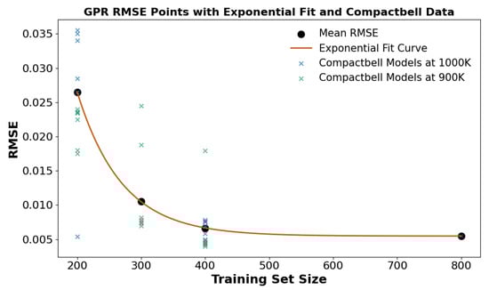 Root mean square error (RMSE) as a function of training set size for the GPR-MGK models.
