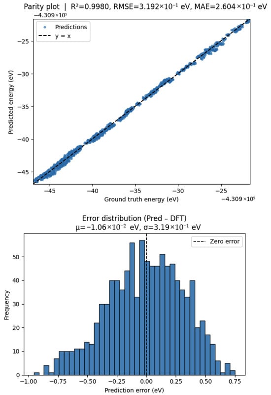 (Upper): Parity plot of GPR-MGK predicted energies versus DFT reference energies for the validation set. The model achieves , eV, and eV. (Lower): Error-distribution histogram (Pred − DFT), showing residuals centered near zero. The mean error is eV with a standard deviation eV.