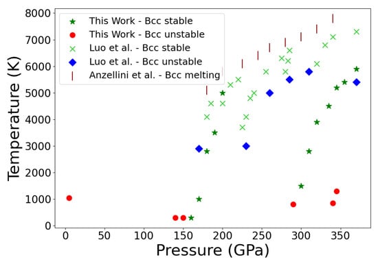 Comparison of mechanical stability based on the lack of of imaginary phonon dispersions at different temperatures and pressures obtained by this work with previous studies [,]. Experimental melting curve measurements included for reference.