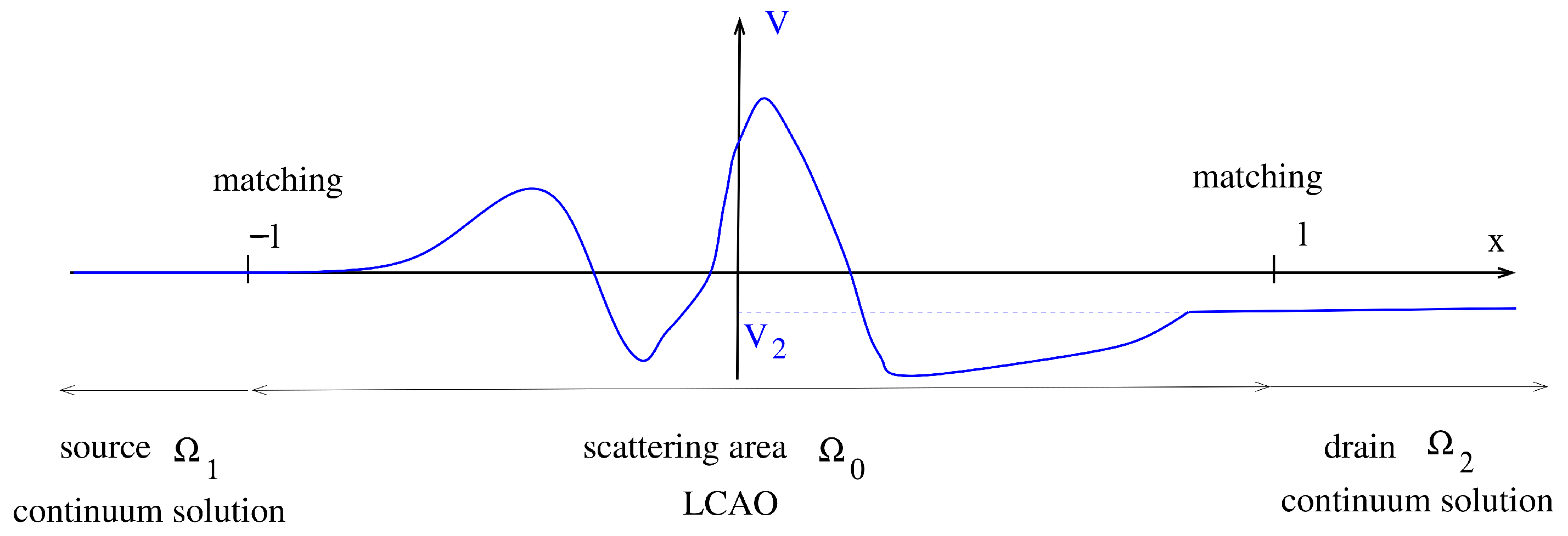 with ϵ = 2 m E / 2 and v ( x ) = 2 m V ( x ) / 2 . As shown in Figure 1 the potential exhibits the asymptotics V ( x l ) = 0 in the source Ω 1 and V ( x l ) = V 2 = e U D in the drain Ω 2 . We approximate the wave function in the the scattering area Ω 0 = l , l as an LCAO-type linear combination