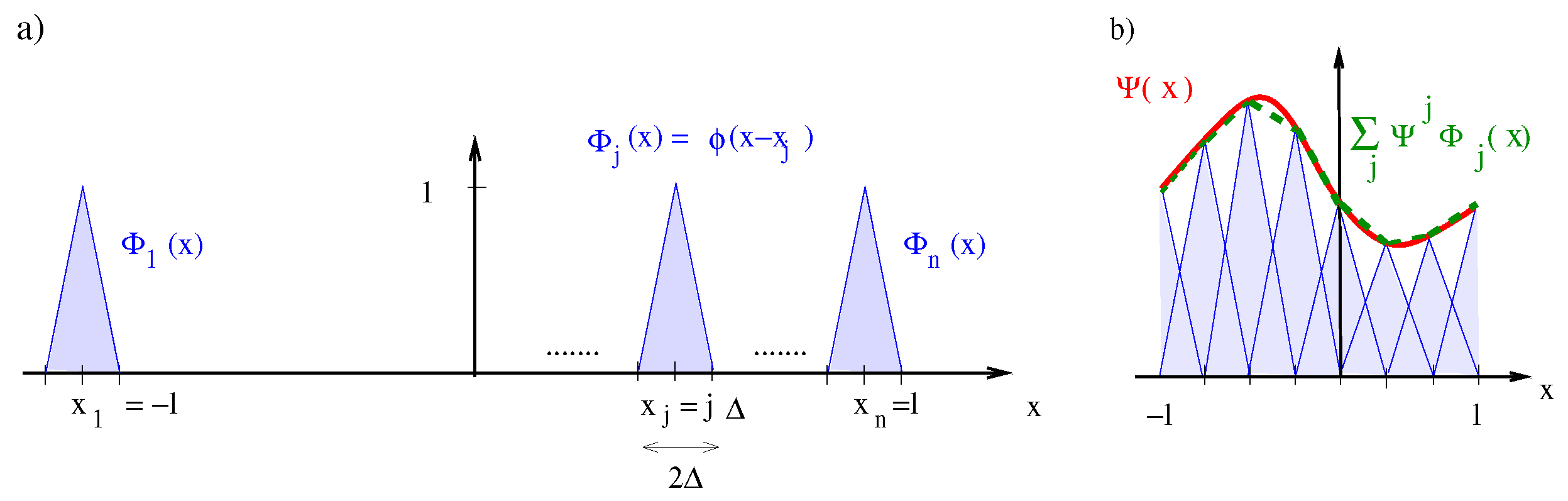 of n appropriately chosen real basis functions Φ j ( x ) . We cast Equation (1) in weak formulation according to the method by Galerkin [20] and project onto the space of wave functions spanned by the basis functions Φ j by multiplication of (1) with Φ j and after subsequent partial integration we require