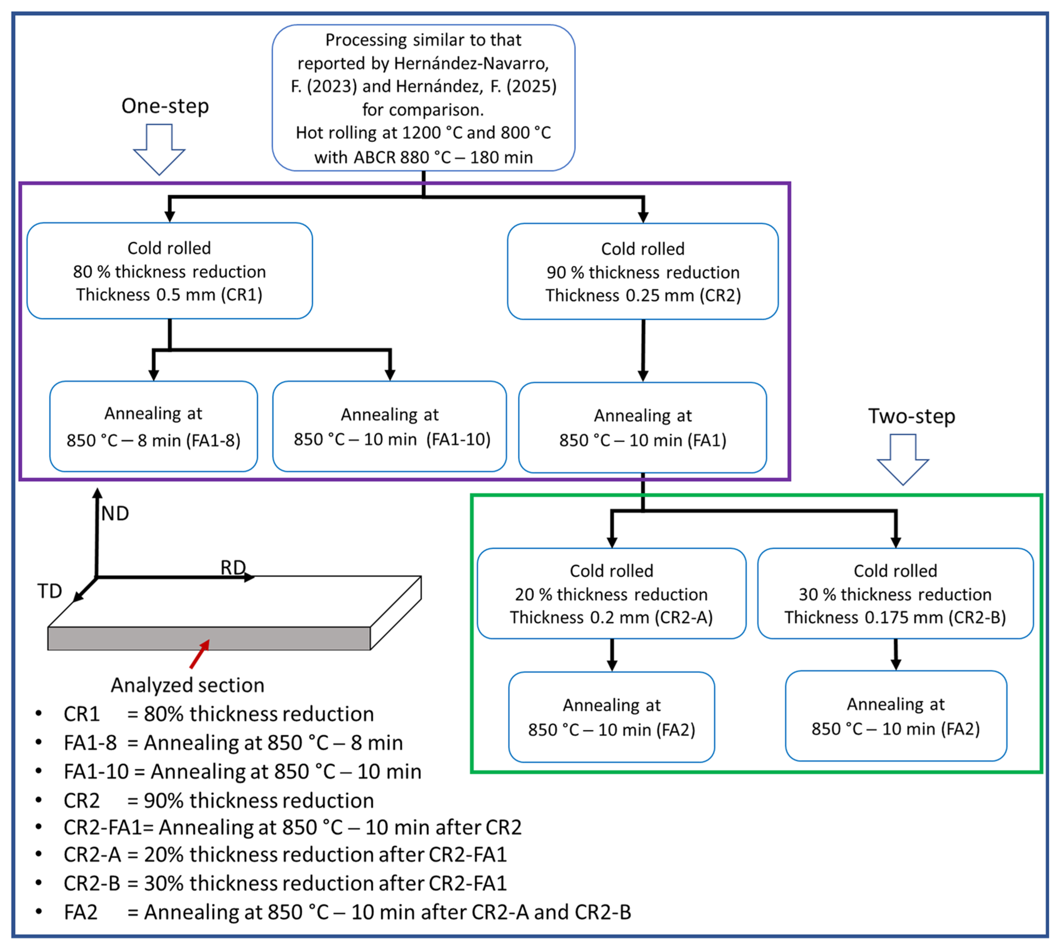 Figure 1). In the second stage, samples of 0.25 mm thickness were cold-rolled to achieve an additional thickness reduction of 20% (CR2-A = 0.20 mm thickness) and 30% (CR2-B = 0.175 mm thickness), followed by a second annealing conducted at 850 °C for 10 min (FA2), two-step cold rolling and annealing schedule (green rectangle in