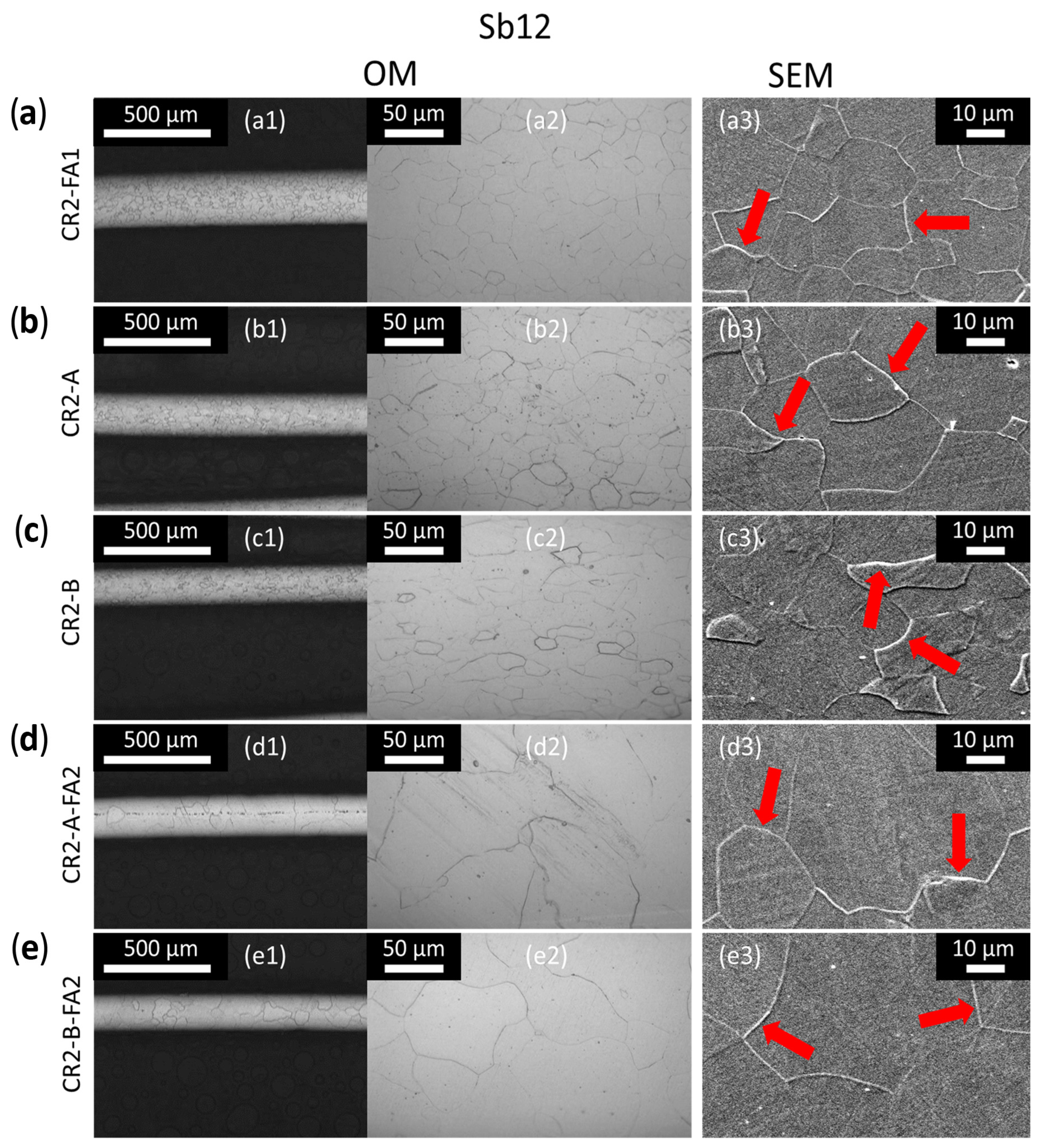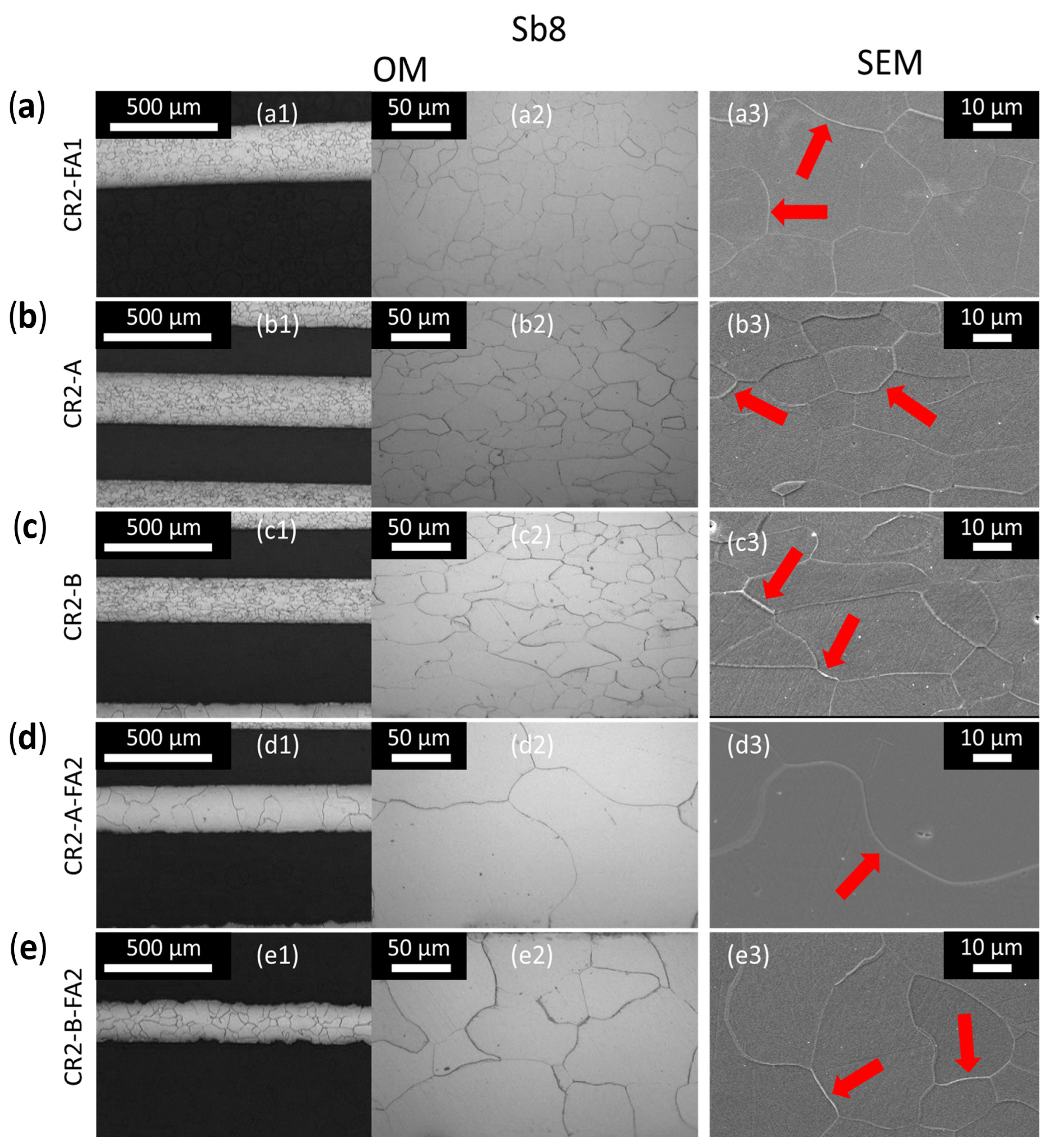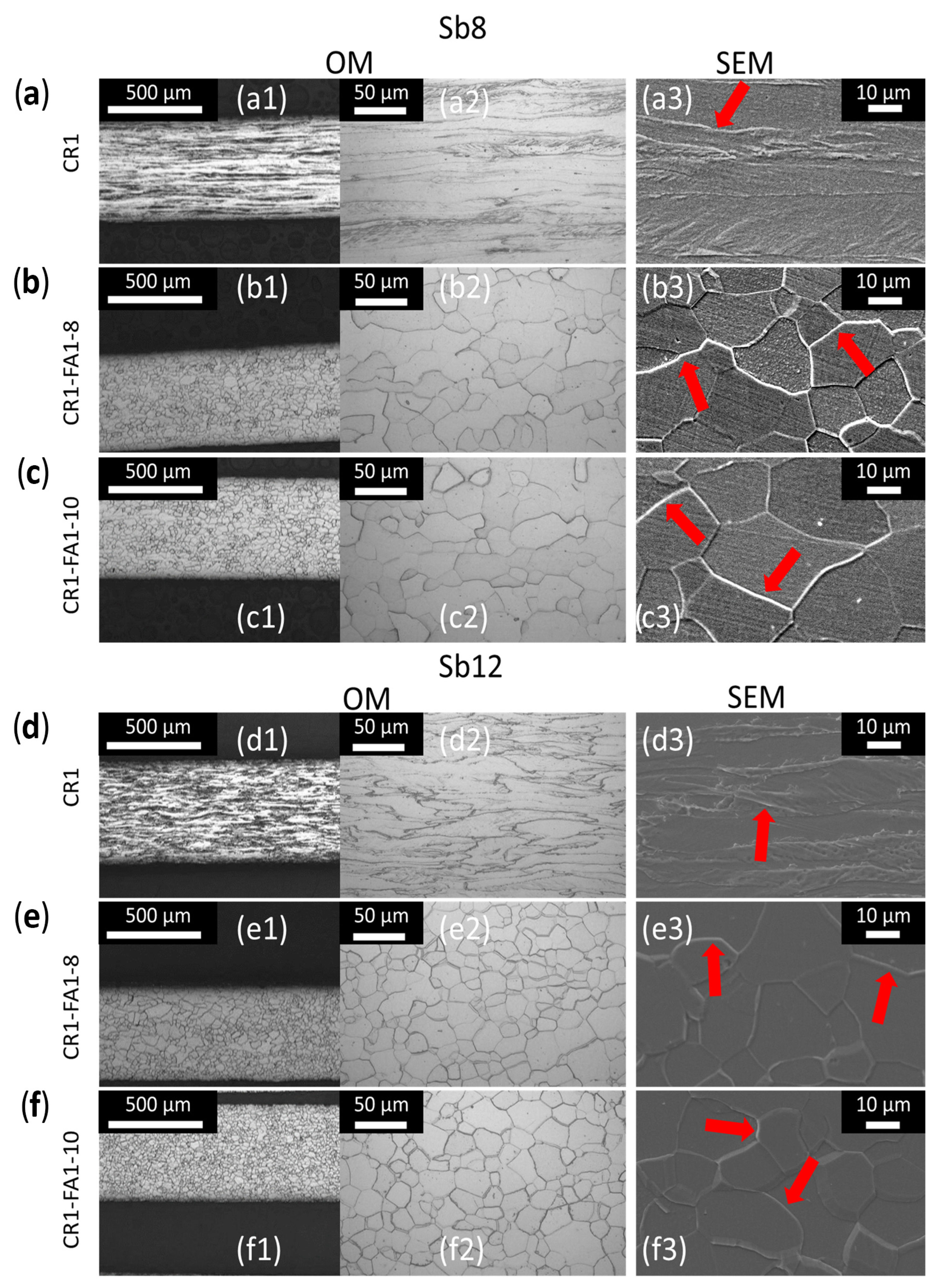 16]. When steels were cold-rolled to 0.25 mm and annealed at 850 °C for 10 min, the microstructure was very similar in both steels (Sb8 and Sb12), and it was also characterized by the presence of recrystallized grains (