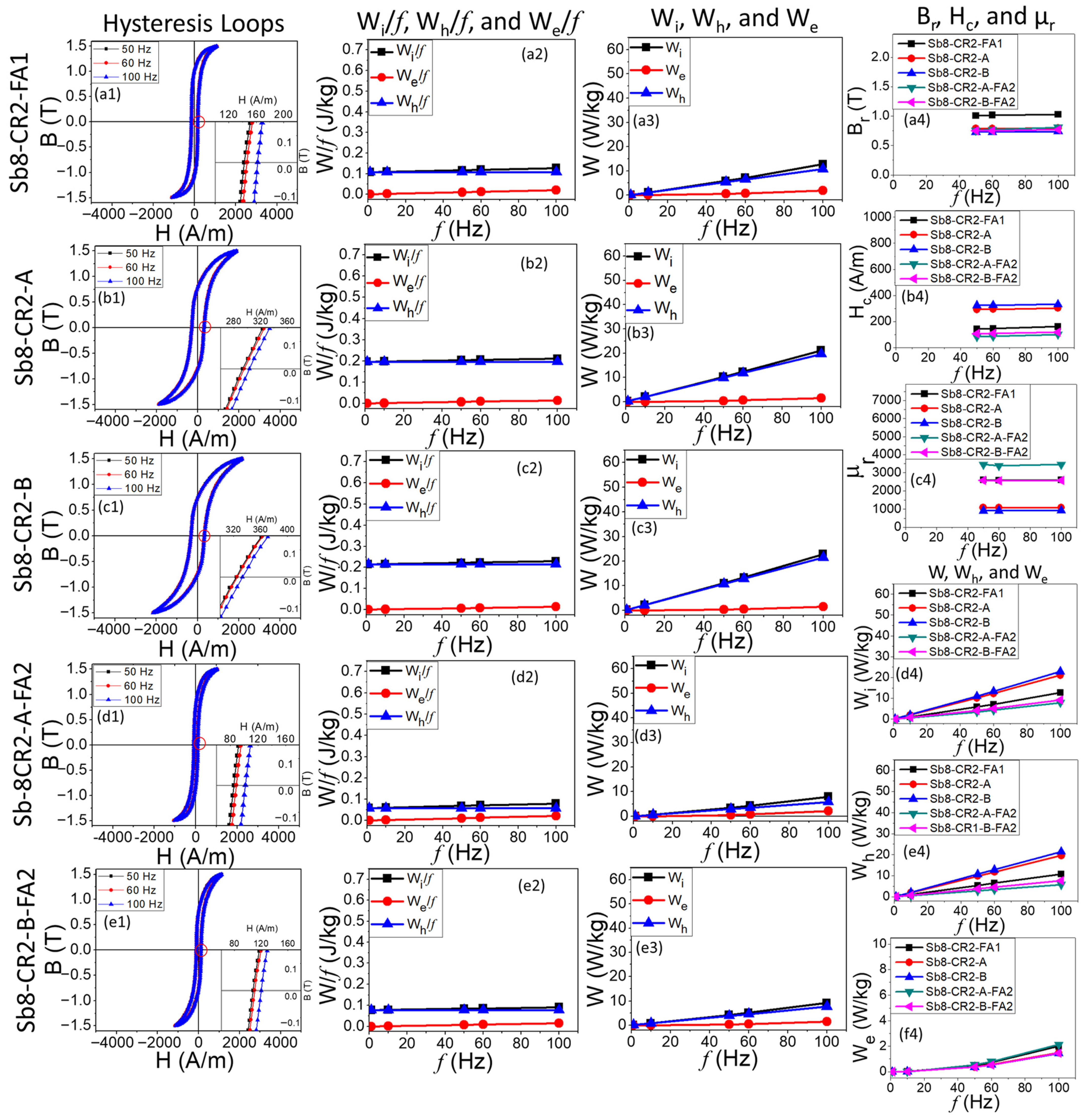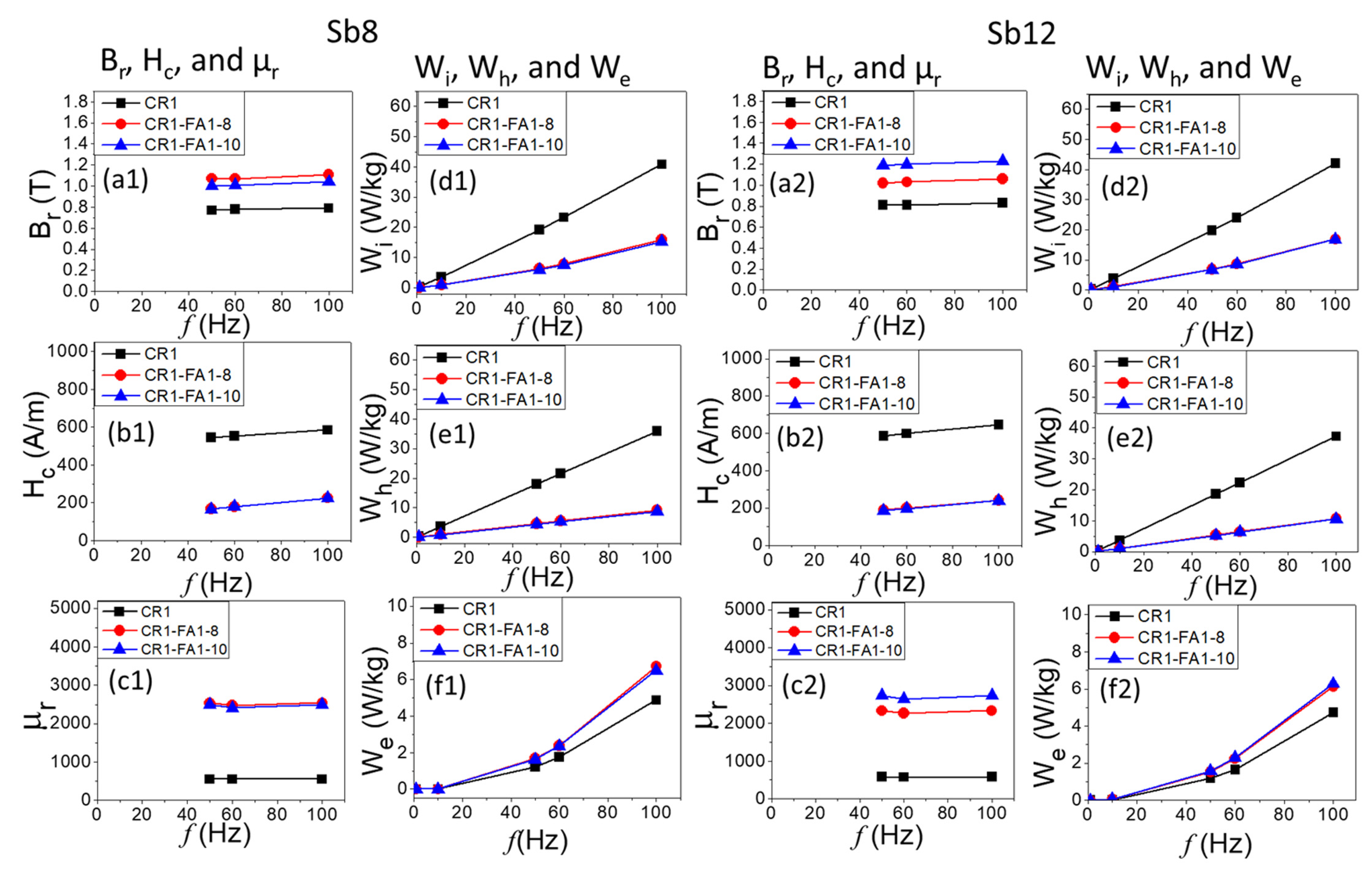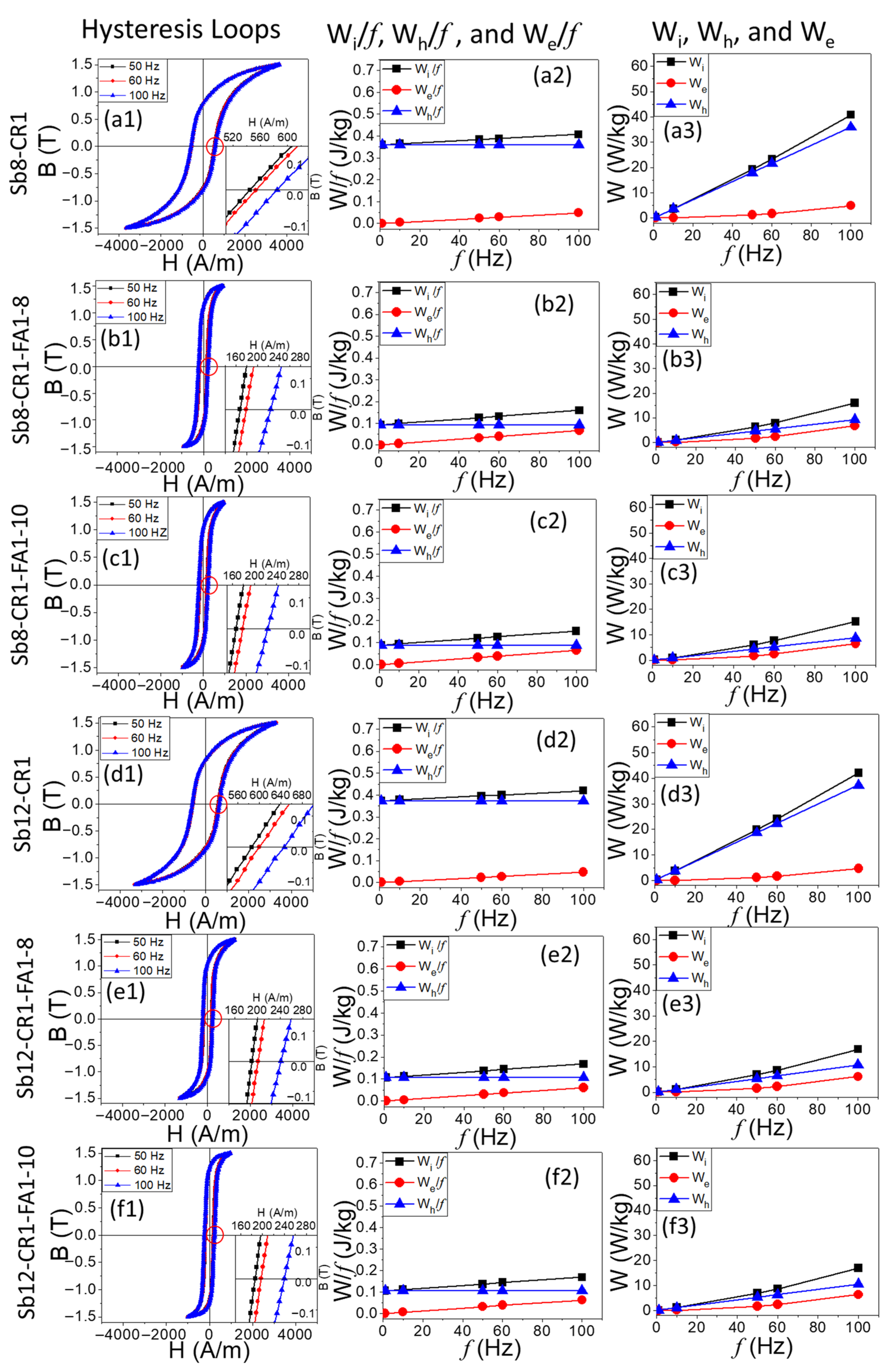 25]. In both steels (Sb8 and Sb12) and for the two thicknesses (0.5 mm and 0.25 mm), similar behavior in the losses and coefficient losses (W/f) curves is observed, and core loss (W
