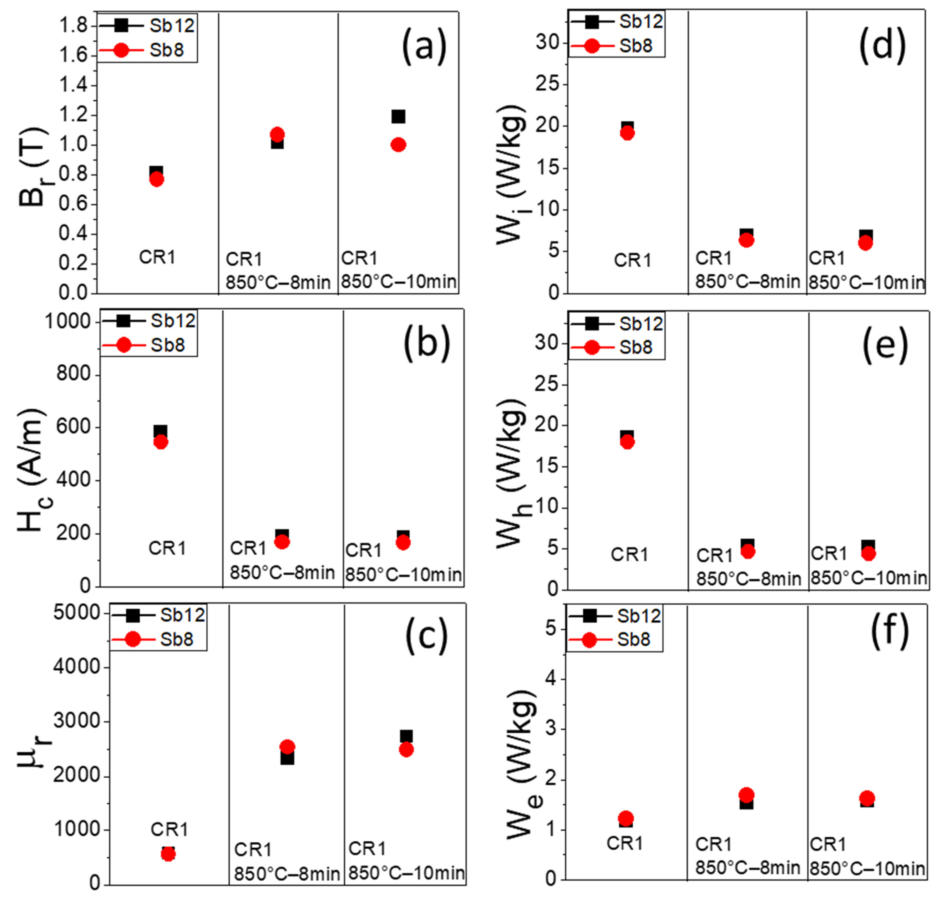 Magnetic properties of both steels (Sb8 and Sb12) after cold rolling (0.25 mm thickness), annealing (850 °C–10 min), second deformation (20% and 30%) and second annealing (850 °C–10 min) are presented in