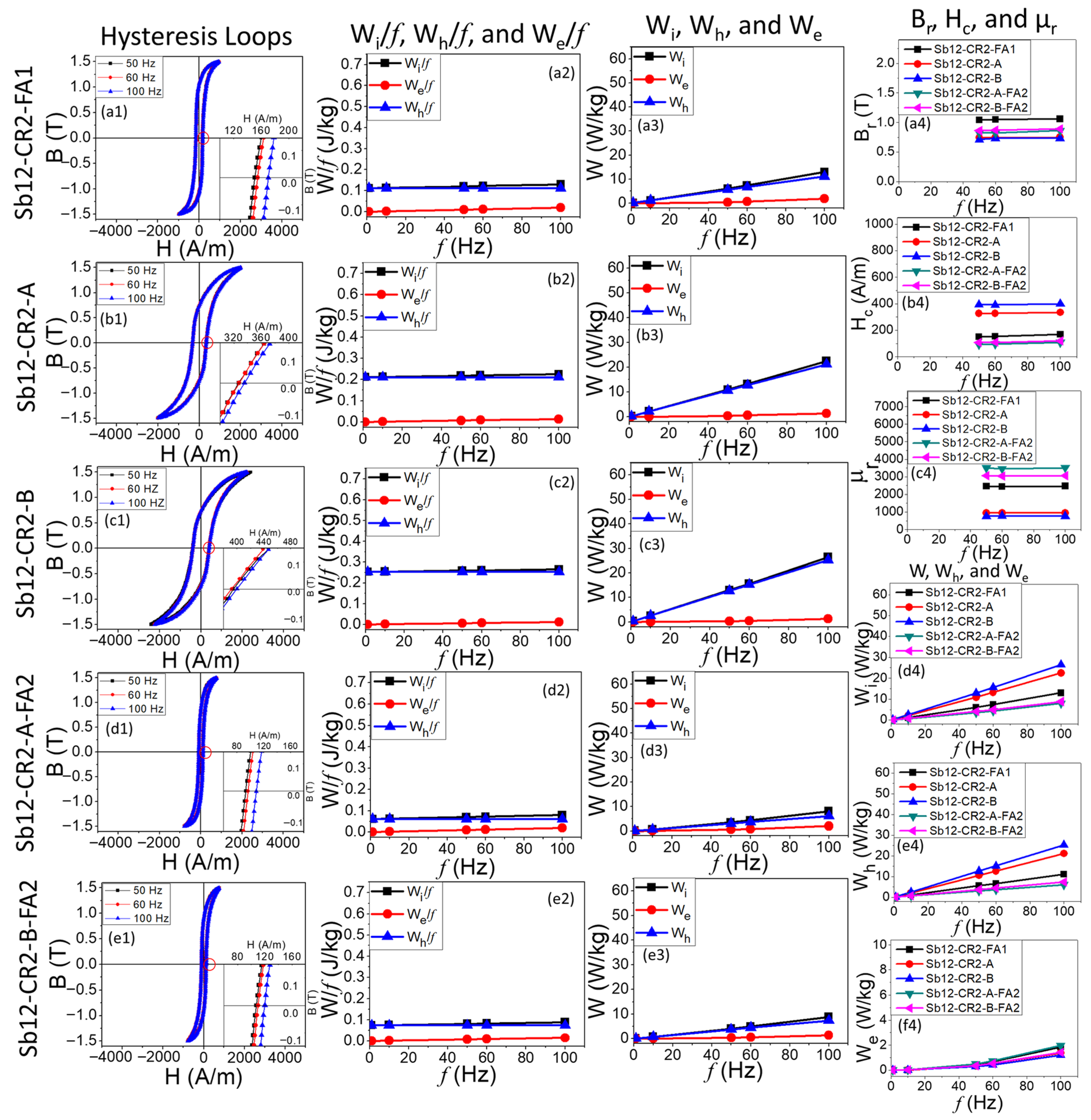Figure 12 is only observed for the coercive field and relative magnetic permeability properties, where increasing grain size reduces the amount of grain boundaries, which reduces the coercive field, increases the magnetic permeability, and reduces the hysteresis loss, allowing easy movement of the domain walls after applying the magnetic field. Other authors mention that increasing grain size decreases the magnetic domain wall area but increases the magnetic domain size. In relation to this, hysteresis losses decrease with the reduction in magnetic domain wall area, and eddy current losses decrease with the reduction in magnetic domain size [