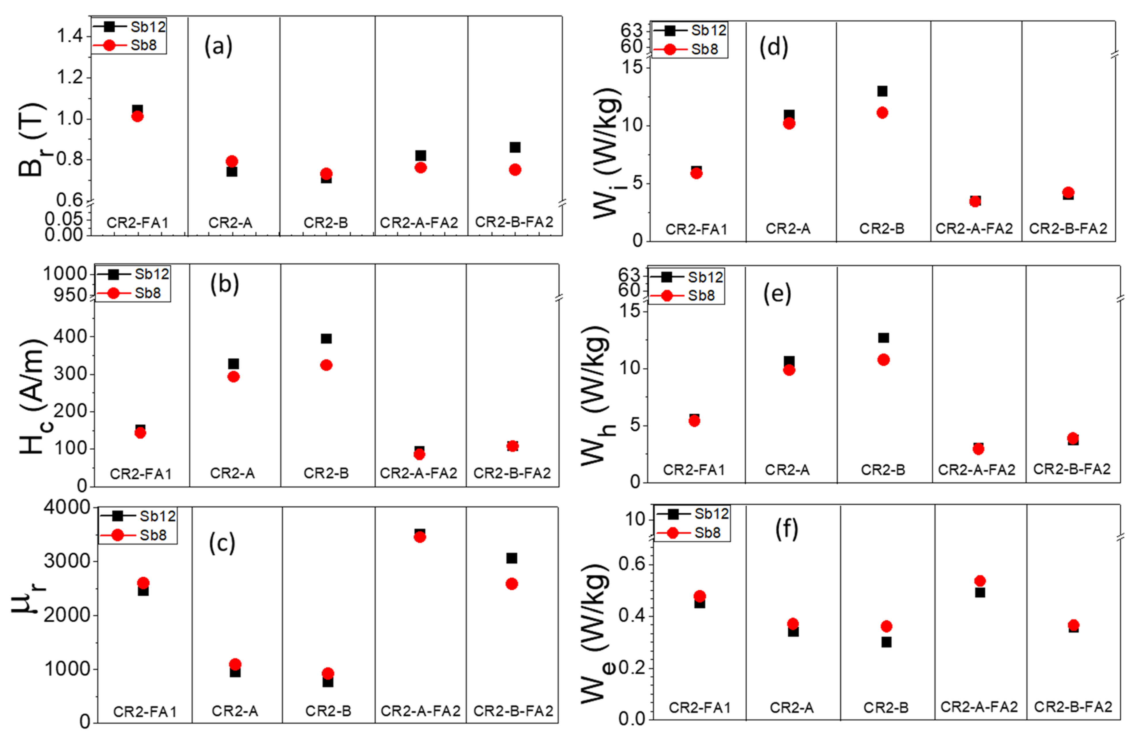 19]) slightly lower than the ones obtained in the Sb8 and Sb12 steels (3.44 W/kg and 3.52 W/kg). However, in one case, this has been reported in steels with higher silicon content, in which a reduction in thickness was also applied in two stages, although the thickness was greater with respect to the steel of this work. The influence of the Si content allowed for obtaining lower energy losses [