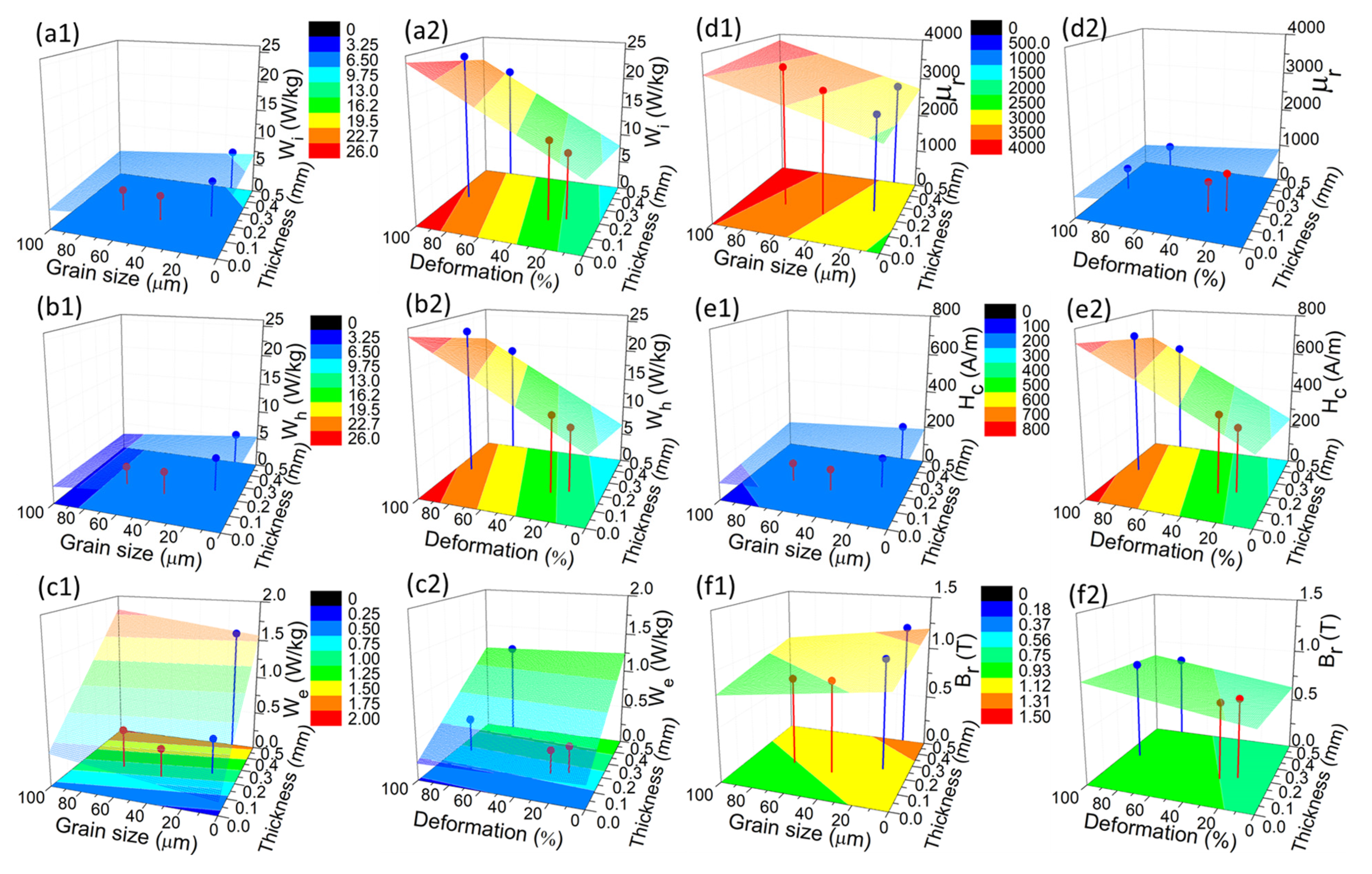 Figure 12). However, subsequent annealing produces an increase in eddy current losses. In annealed samples, the lowest eddy current losses were obtained for the smallest thickness and the smallest grain size. In deformed samples, the greatest reduction was obtained for the lowest thickness with greater deformation (compare