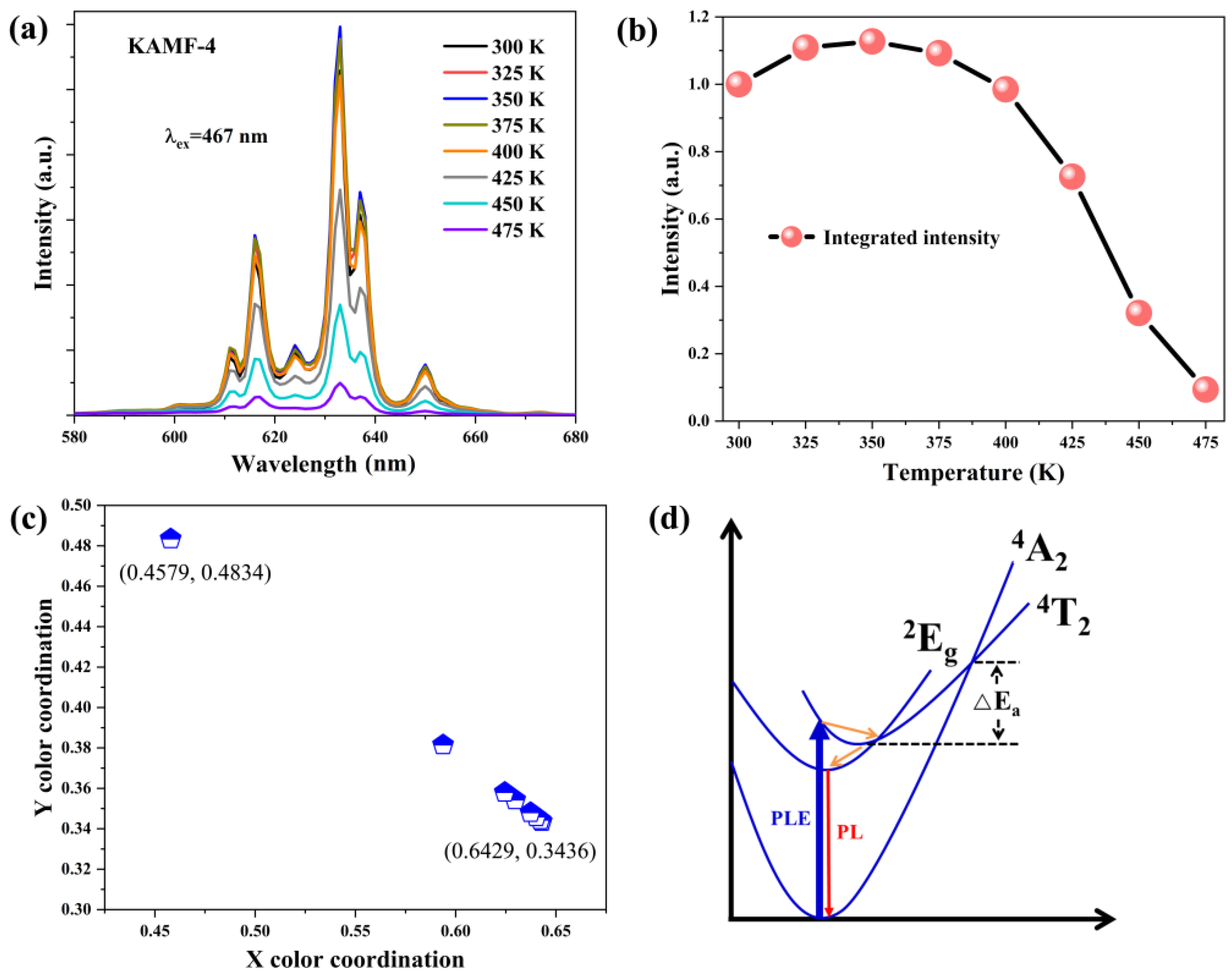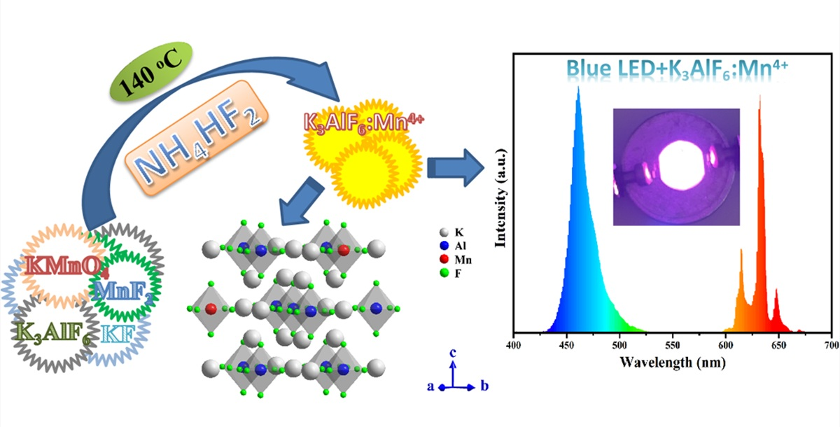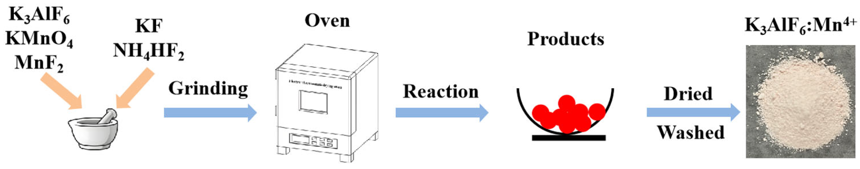 - Xu, Y.; Su, H.; Gao, Y.; Zhang, S.; Li, L.; Hong, F.; Xu, Y.; Yu, D.; Lin, H. A red-emitting phosphor Na3AlF6: Mn4+: Green synthesis, optical characteristics, thermal stability and application in high-performance warm WLED. J. Solid State Chem. 2024, 340, 125016. [Google Scholar] [CrossRef]