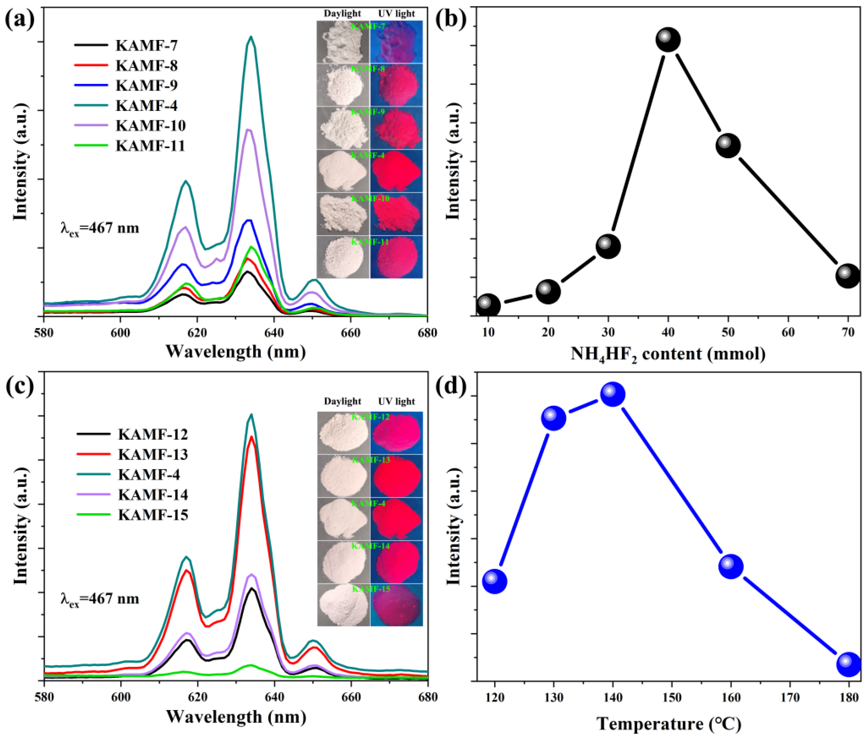 - Deng, T.; Song, E.; Zhou, Y.; Chen, J.; Cheng, Y.; Yuan, J.; Fan, T. The use of a single ammonium acidic salt towards simple green co-precipitation synthesis for Mn4+-activated fluorides. Dalton Trans. 2020, 49, 5823–5831. [Google Scholar] [CrossRef]