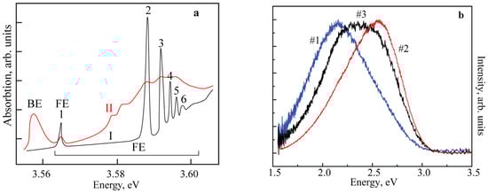 We have established that annealing of SnO2 single crystals at 750 °C and a pressure of 10−3 Torr for 3 h leads to strengthening and broadening of the bound exciton band in the absorption spectra (Figure 1a) as well as to the appearance of high conductivity at low temperatures. The reason for these changes may be an increase in Ov concentration during annealing, accompanied by formation of clusters differing from each other by the number of defects and their configuration. The inhomogeneous broadening of the bound exciton band is probably due to the dispersion of their binding energy with such clusters.