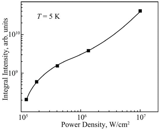 A flattening of the integral PL intensity vs. power density is observed between 4·104 and 2·105 W/cm2 (Figure 5). We assume that this is due to the photo-induced activation of the non-radiative centers and their subsequent saturation.