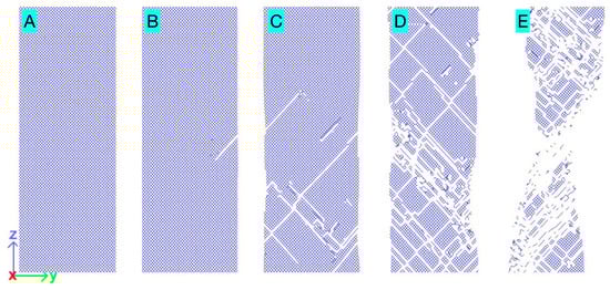 Figure 4 presents visualizations (snapshots) of atomic bonds in the tensile-tested Pt within a selected single atomic layer near the central x-position, spanning the full y-range and a reduced z-range that captures the final necking region (refer to the lower panel in Figure 1 for 3D views of the full sample). The five snapshots correspond to the five states (A–E) marked on the stress–sample strain curve in Figure 1. In the elastic regime (state A), the bonds are stretched in the z-direction (and compressed in the x and y directions), and the snapshot shows no broken bonds. At yielding (state B), the snapshot shows that some bonds have been broken due to the passage of the first-nucleated dislocations. In the subsequent plastic deformation, as more dislocations were dynamically generated (and annihilated) in the sample and moved through this atomic layer, the snapshots for states C, D, and E show an increasing number of broken bonds. It is important to note that the broken bonds observed in the single atomic layer do not represent actual “holes” in the structure. The atoms involved in the broken bonds are, in fact, reconnected with atoms in neighboring atomic layers through new bonds. At any step of plastic deformation, the remaining original bonds and the newly formed bonds work together to provide the structural integrity of the sample, requiring continued stress for further sample strain.