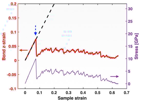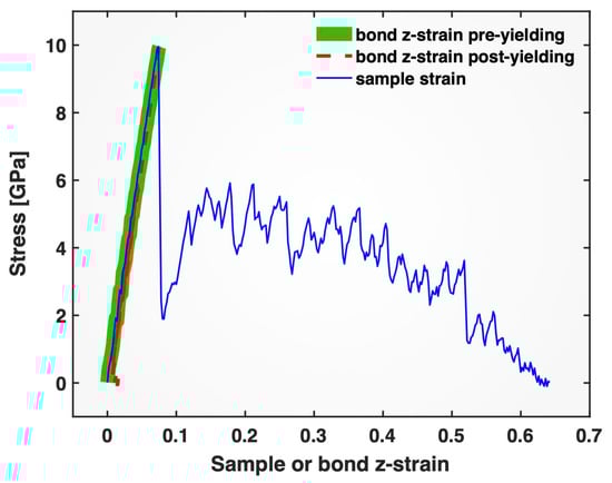 The close correlation between the bond z-strain and the sample stress appears even more striking when the stress is plotted directly against the bond z-strain, as shown in Figure 6 by the thick green line prior to yielding and the thin dashed red line after yielding. For comparison, the conventional stress versus sample strain plot (thin blue line) is also included in the same figure. In stark contrast to the well-known highly non-linear stress–sample strain correlation during plastic flow, the correlation between the stress and the bond z-strain remains nearly perfectly linear throughout the extended plastic regime (except for the very final fracture stage). In this presentation (Figure 6), the erratic fluctuations in both the stress and the bond z-strain seem to have disappeared, but this is only because their fluctuations are so well matched, as shown in Figure 5: whenever the bond z-strain increases, the sample stress increases, and whenever the bond z-strain decreases, the sample stress decreases, and their ratio, which can be understood as a “bond modulus” (sample stress over bond z-strain), remains nearly constant.