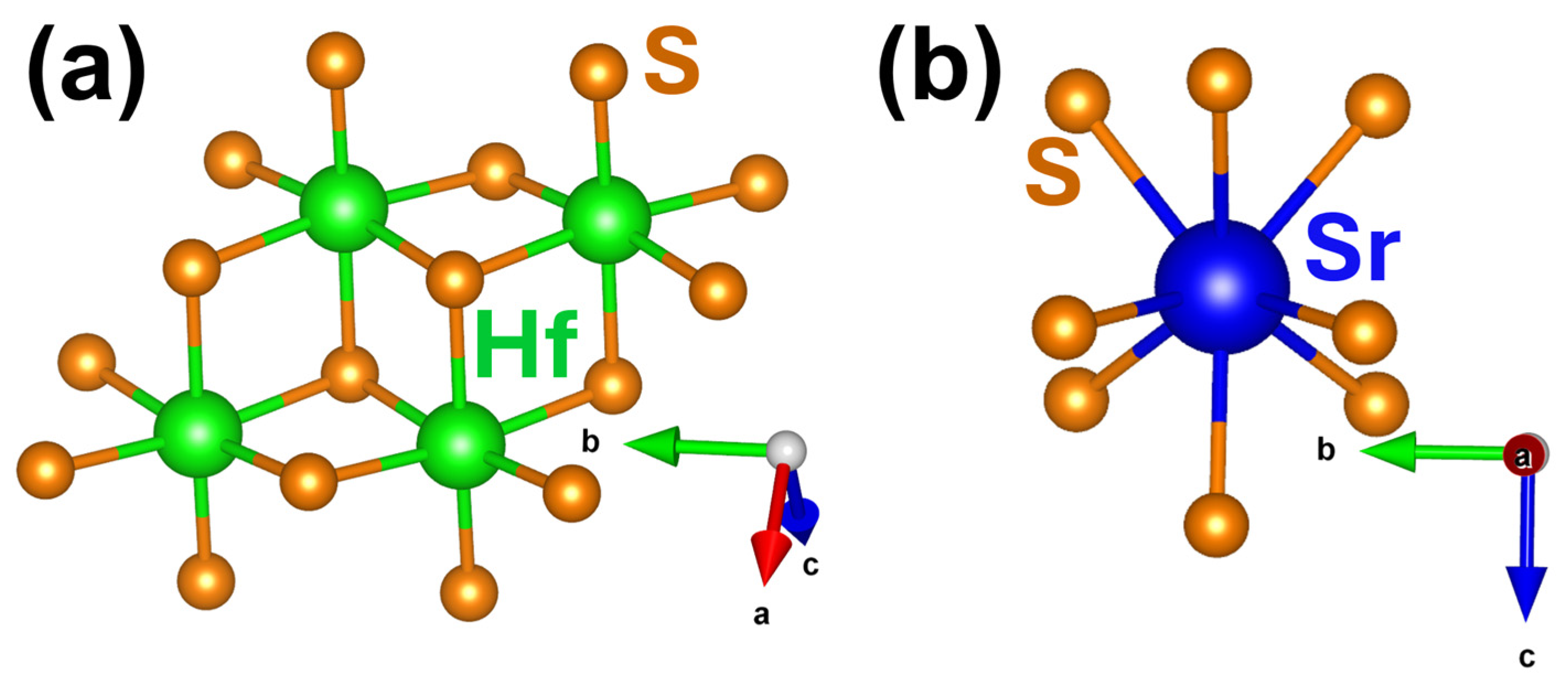 | Hf1-S2 | 2.5525(8) × 2 | Sr1-S3 | 3.080(1) × 2 |