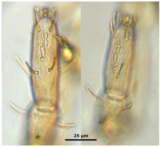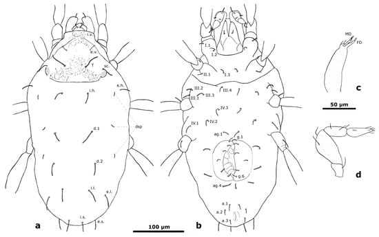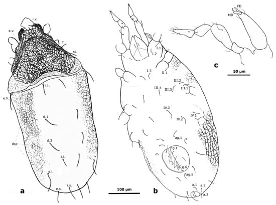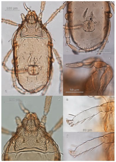 Description: Soft-bodied mite well sclerotized with a clearly visible sculptured pattern on the dorsum. The body length of the holotype is 566.89 µm; the average length of the adult specimens studied is 563 µm, with values ranging from 537 to 582 µm (±13.57). The adults of the species are comparable in size with S. belli [5]. The shape of the body is similar to the other species of the genus and the furrow dividing the propodosoma from the hysterosoma is evident both ventrally and dorsally. The morphological features are illustrated in Figure 6, Figure 7 and Figure 8.