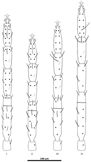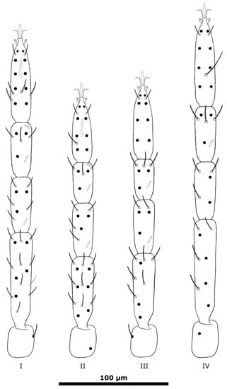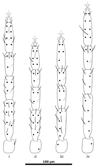 S. nunatakis sp. nov. Leg chaetotaxy; black dots represent the setae on the ventral side; outlines after the drawings of Pittard [2] and arranged with proportions and details of S. nunatakis individuals.