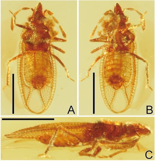 The insect paleofauna of Kachin amber is particularly interesting in comparison with that of the present day. For instance, some fossil species represent a miniaturization phenomenon compared to extant taxa [16,17,18]. On the other hand, no fossil occurrence showing such miniaturization has been documented in Tingidae to date.