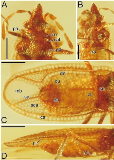 - Heiss, E.; Guilbert, E. A new species of Burmacader Heiss & Guilbert, 2013 from Cretaceous Burmese amber (Hemiptera, Heteroptera, Tingidae). Palaeoentomology 2021, 4, 30–33. [Google Scholar] [CrossRef]
