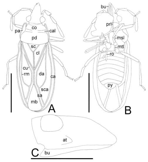 Line drawings of Burmavianaida anomalocapitata gen. et sp. nov. from mid-Cretaceous Kachin amber (holotype, AMNH Bu-SY29): general habitus, dorsal and ventral views (A,B); head, lateral view (C). Abbreviations: at, antenniferous tubercle; bu, buccula; ca, costal area; cal, calli; cl, clavus; co, collar; cu, Cu (cubital) vein; da, discoidal area; hl, hypocostal lamina; mb, membrane; msl, mesosternal lamina; mtl, metasternal lamina; pa, paranotum; pd, pronotal disc; prl, prosternal lamina; rm, R+M (radiomedial) vein; ro, rostrum; py, pygophore; sa, sutural area; sc, scutellum; sca, subcostal area. Ventral surface partly obscured by impurity. Scale bars: A, B, 0.5 mm; C, 0.2 mm.