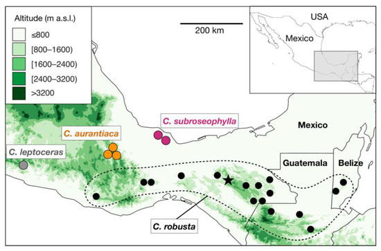 Distribution map of the known populations of Ceratozamia robusta species complex. Black circles surrounded by a dotted line indicate the occurrence of populations of C. robusta, as currently circumscribed. The star symbol indicates the neotype locality of C. robusta (Parque Nacional Cañón del Sumidero, Chiapas, Mexico). Ceratozamia subroseophylla, previously considered as C. robusta, has been recorded in two areas in Santiago Tuxtla, Veracruz, Mexico. The putative new species (herein named Ceratozamia aurantiaca; see results) occurs in two localities in the Sierra Norte region, Oaxaca, Mexico; these populations have been long considered as C. robusta. Green color scale indicates the elevation in meters above sea level (m a.s.l.) as recorded in the raster layers of 30-s resolution of the NASA Shuttle Radar Topographic Mission (SRTM) 90 m Digital Elevation Database v4.1 deposited in DIVA-GIS (https://www.diva-gis.org/, accessed on 15 July 2021).