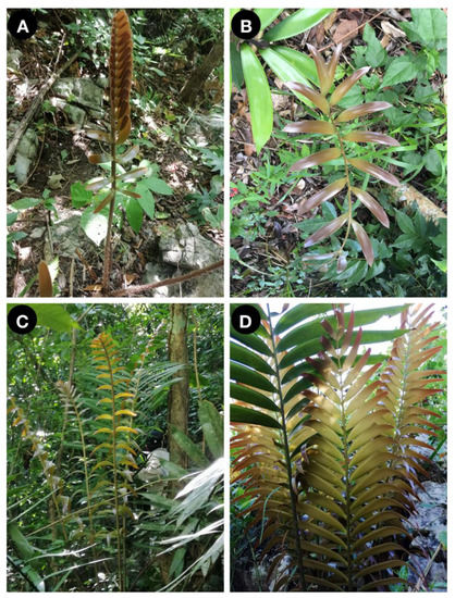 Emerging leaf color in a Ceratozamia aurantiaca sp. nov. population from San Pedro Teutila, Sierra Norte region, Oaxaca (Mexico). The orange-brown color occurs early in emergence and appears in juveniles (A,B) and adults (C,D).