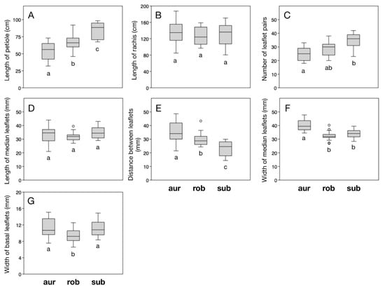 Morphometric variation among the three compared species: Ceratozamia aurantiaca (aur), C. robusta (rob), and C. subroseophylla (sub). The order of plots corresponds to the traits (A–G) listed in Table 3. Whiskers indicate standard errors and circles indicate outliers. Different lowercase letters below the bars indicate significant differentiation as estimated in the Tukey’s pairwise test (numerical values in Table 4).
