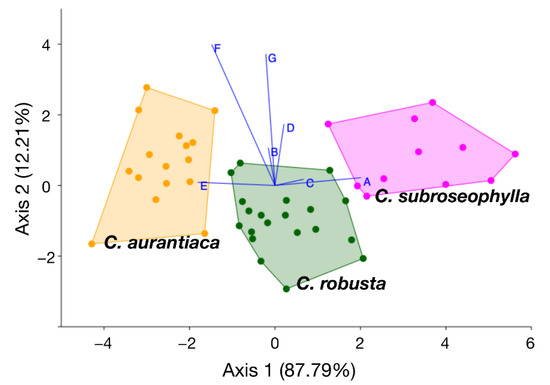 The LDA summarized the total morphometric variation into two main axes, explaining 87.79% and 12.21% of the total variation, respectively (Figure 4). Three trait groups were found to be completely non-overlapping, as denoted by the biplots in Figure 4 (load values are listed in Table 3): petiole length (trait A), number of leaflets (trait C), and space between median leaflets (trait E). The confusion matrix obtained from the LDA (Table 5) shows that most individuals were estimated to belong to their given groups, as expected; only one individual of the putative new species might be confused with C. robusta, and only two individuals of C. robusta might be confused with the putative new species. However, the Mahalanobis distances among the three groups were estimated to be highly significant (Table 6), suggesting that the total variation completely sorted between the assigned groups.