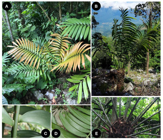 Ceratozamia aurantiaca sp. nov. (A) Adult plant with orange emerging leaves beginning to transition to green. (B) Adult plant with erect trunk. (C,D) Details of leaflet articulation, prickles, and leaflet shape. (E) Details of apex and heavily armed petioles.