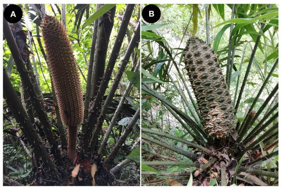Mature microstrobilus (A) and immature megastrobilus (B) of Ceratozamia aurantiaca sp. nov. at Fairchild Tropical Botanic Garden, FL, USA.
