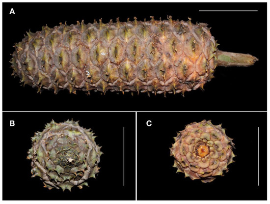 Mature megastrobilus of Ceratozamia aurantiaca sp. nov., showing details of megasporophylls and peduncle (A), mucronate apex (B) and view from below (C). Scale = 10 cm. Photos by José García.