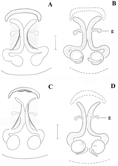 Drassyllus centrohellenicus n.sp. (paratype) (A,B) and Drassyllus dadianus n.sp. (C,D) (FC: 12148). (A,C) epigyne, (B,D) vulva. g: lateral gland.