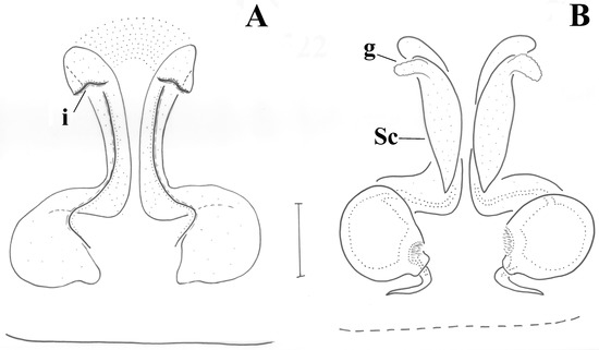 Drassyllus covid n.sp. (holotype). (A) Epigyne, (B) Vulva. i: introductory orifice, g: gland, Sc: spermathecal sac.