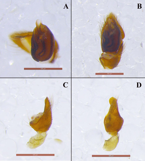 - World Spider Catalog 2021. Natural History Museum Bern. Version 22.0. Available online: http://wsc.nmbe.ch (accessed on 19 April 2021). [CrossRef]