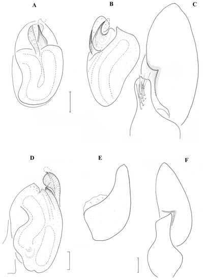 Pedipalp as in Figure 12A,C,D and Figure 13. Large retrolateral tibial apophysis diagonally directed and accommodated into cymbium depression, with round ventral edge and tapering dorsal tip, taking various shapes in different angles (see Figure 12C,D and Figure 13C,E,F). Large spermophore U-shaped. Embolus with broad round base hidden behind conductor in ventral view, tapering at its end, and terminating in a fine filiform free part. Conductor with stout vertical part and enlarged membranous fold encircling the embolus.