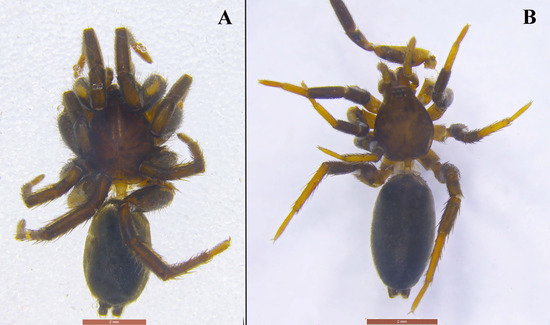 Zelotes histio n.sp., habitus. (A) Holotype (fully mature), (B) penultimate form (FC: 17147).