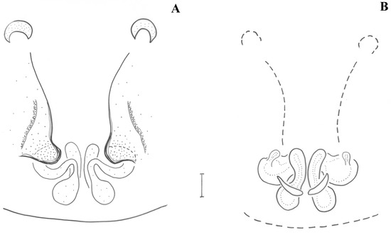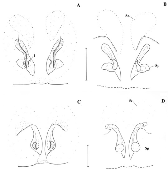 Epigyne as in Figure 15A,C. Lateral margins like two slightly curved and diverging lines; no anterior margin present. In the penultimate form, there appear two lines like inverted L’s (Figure 15C), which in the fully developed holotype are only evident viewed from dorsally (Figure 15B). Introductory openings towards posterior end. Vulva as in Figure 15B,D. Spermathecae (Sp) of peculiar shape like transverse droplets; copulatory ducts small, straight. Two additional sacs (Sc) appear just above the L-shaped sclerotizations. In the penultimate form, these sacs, as well as the transverse spermathecae are hardly formed (they appear rather globular); no fertilization ducts are evident in them (Figure 15D).