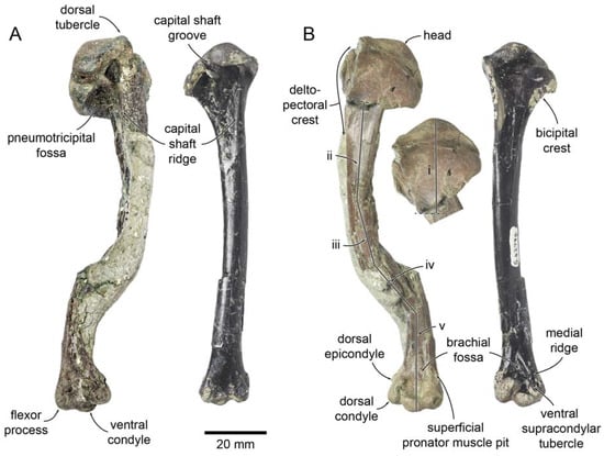Description: The humerus is largely complete but distorted post-mortem (as indicated by the lack of any sign of healed fractures), with the proximal end twisted caudally relative to the shaft and the middle of the shaft displaced dorso-ventrally by about 10 mm. Its total length was calculated by adding together measurements of each fractured section (see Figure 1B). Note that some of this bone’s distortion is in the cranio-caudal plane and, therefore, is not obvious in the figure. The head is prominent and excavated by a well-developed pneumotricipital fossa. The shaft is long and bears a prominent captial shaft ridge. The distal end is robust but notably narrower than the proximal end. The dorsal and ventral condyles are prominent, with the former being separated from the flexor process by a deep caudal depression.